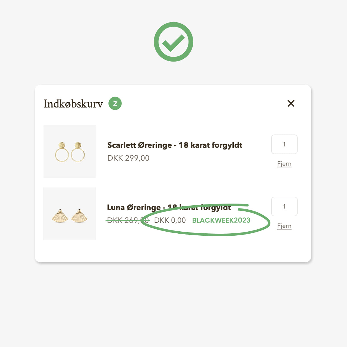 NB! You must therefore put a minimum of two pieces of jewelry in the basket, after which the cheapest one automatically becomes free and stands at DKK 0.00. If you only have one piece of jewelry in the basket, you don't automatically get a piece of jewelry for free.
