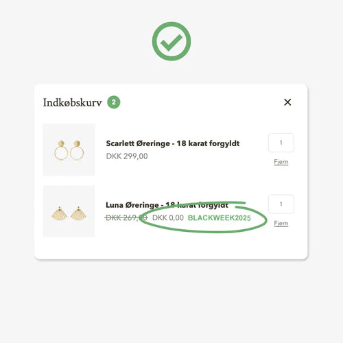 NB! Du skal altså tilføje minimum 2 smykker i kurven, hvorefter det billigste automatisk bliver gratis og står til DKK 0,00 (BLACKWEEK2025). Har du kun 1 smykke kurven får du altså ikke automatisk det/de gratis smykke(r) med.