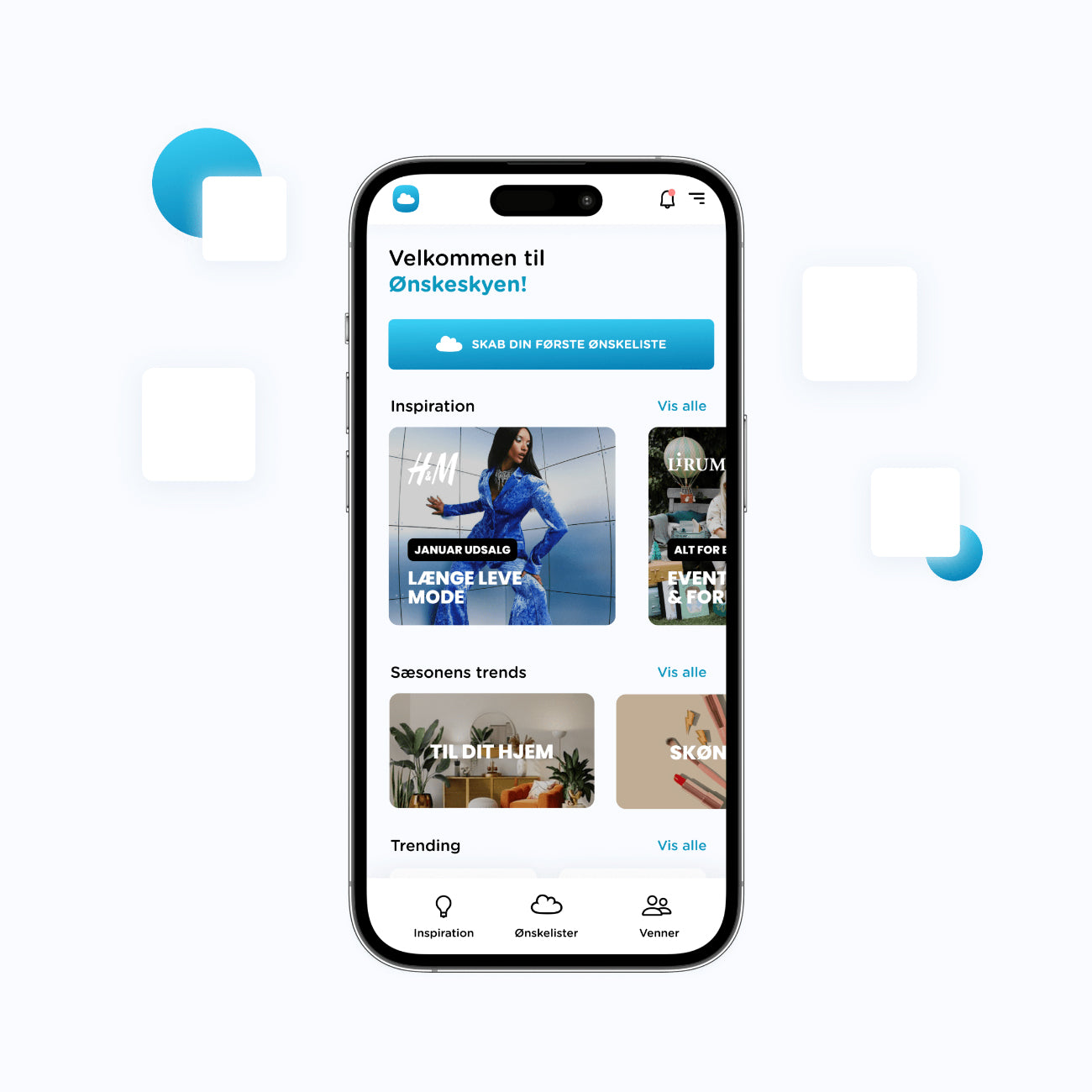 Download Ønskeskyen appen og lav dine egne ønskelister, bliv inspireret og del dine lister med venner.